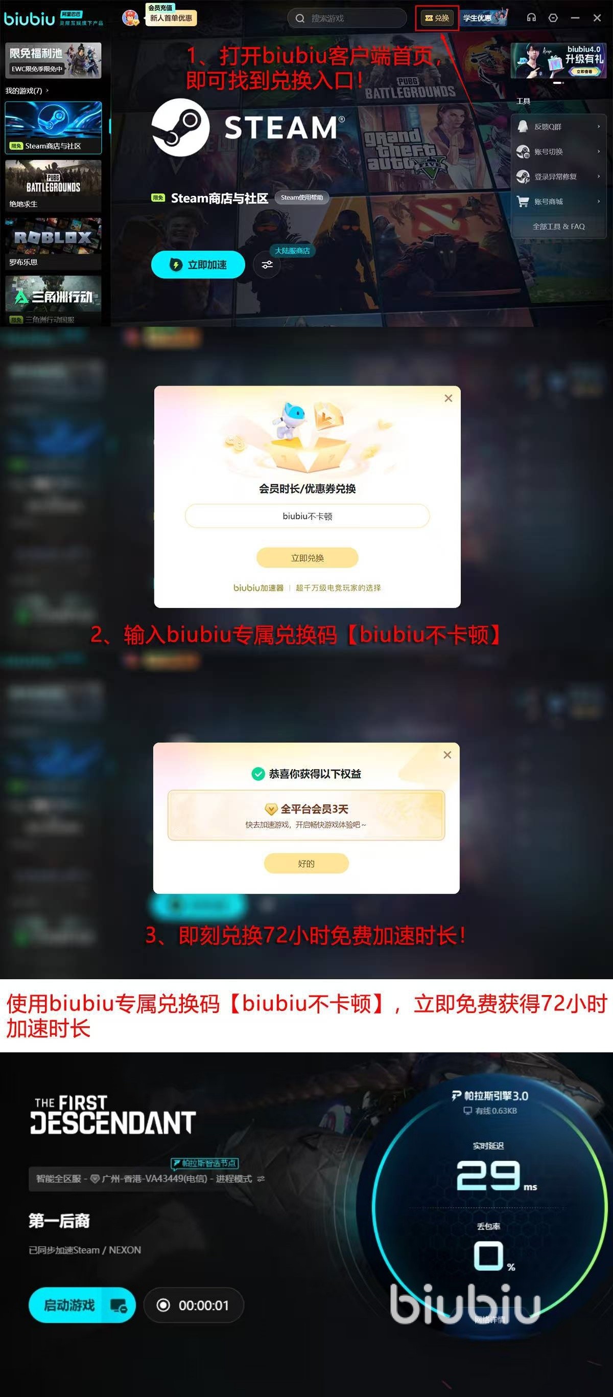 为了极大降低用户的尝试门槛,现在新人首次注册会赠送24小时免费加速时间,输入兑换码【biubiu不卡顿】后还可以额外再获得72个小时,两者可以叠加,新人累计96小时稳定加速周期,完全足够覆盖前期的游玩,而且如果在游戏过程中遇到各种解决不了的难题,biubiu内拥有着详细的攻略解答。