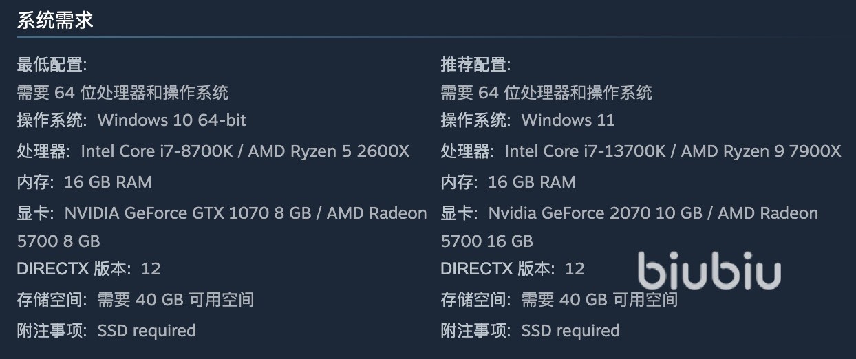它对硬件的最低要求是这样的:处理器起码要i7-8700或者AMD Ryzen 5 2600x,内存得16GB,显卡得英伟达1070或者RX 5700 8GB版,硬盘还得留出40GB的空间。由于安装包个头不小对网速也有一定要求,想顺顺利利下完的话,可以搞个专业的biubiu加速器来优化一下。更多信息请看下图: