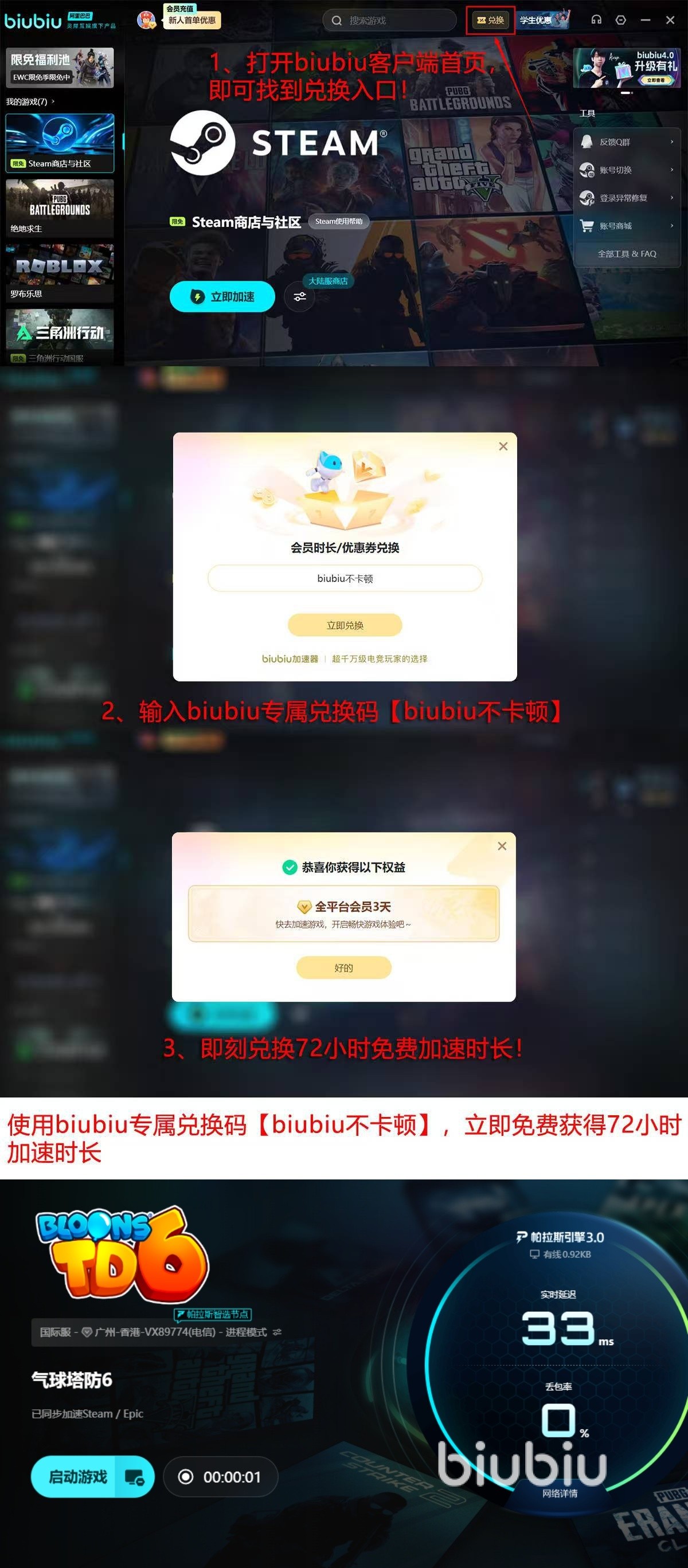 为了降低新人的试用门槛,现在还有零门槛试用机制,新人用户在完成注册之后,就会自动拿到24小时免费体验时间,如果想要进一步延长,还可以输入【biubiu不卡顿】这一兑换码获得72小时,每个账号只限激活一次,可以叠加,也就是说新人可通过这两大权益拿到96小时。