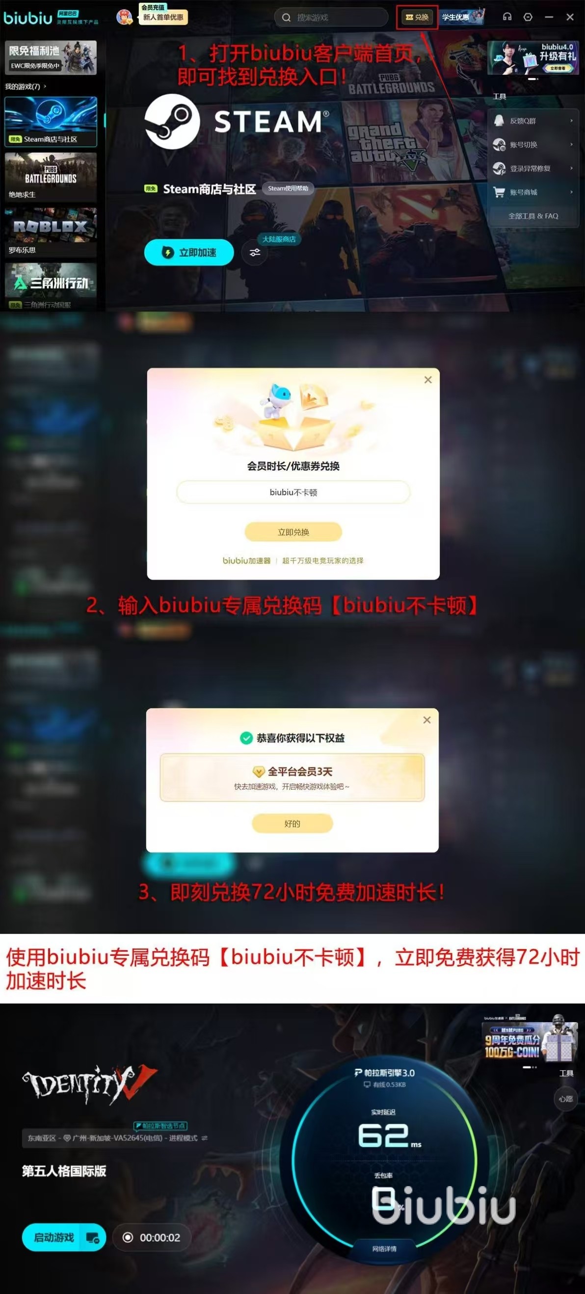 对于新用户来说,注册之后就可以获得24小时全功能免费体验,输入口令【biubiu不卡顿】还可以获得72小时加速时间,总共96小时的免费高品质加速服务。这段时间可以用来玩家检测、调试自己的游戏设置,找到最适合自己设备、网络环境的最优方案。