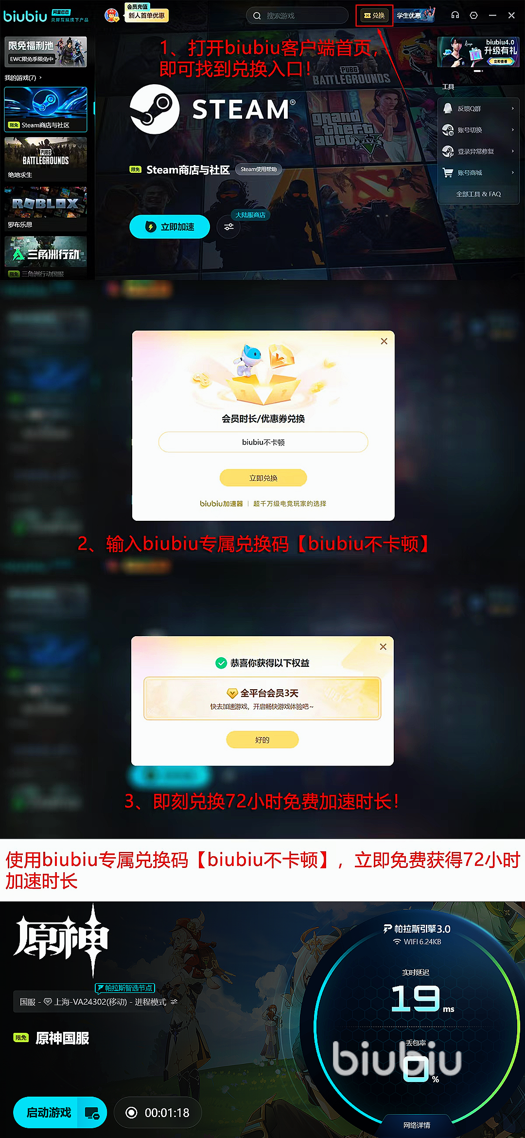 现在新用户注册即可直接领取24小时全游戏免费不限速加速,同时所有用户输入兑换口令【biubiu不卡顿】,都能额外获得3天免费加速时长,新用户可叠加双重福利,最高免费获得96小时加速时长,性价比超高。