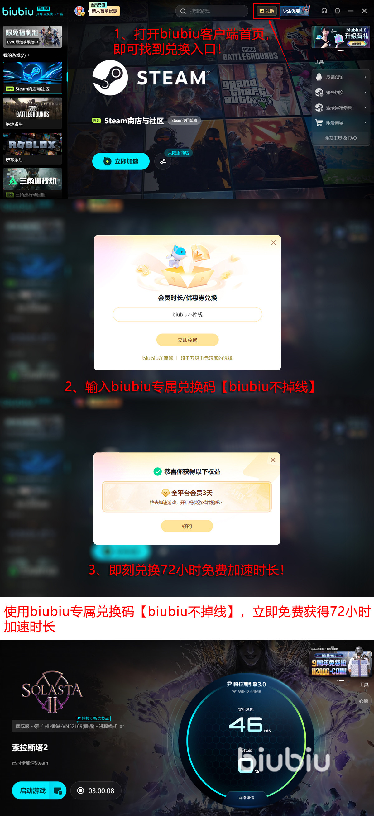 想入手的真可以趁现在,只要在兑换的地方输【biubiu不掉线】就能白嫖3天的全平台高级会员。你要是第一次注册还能再叠加它送的24小时,加起来一共就是96个小时的免费时长。