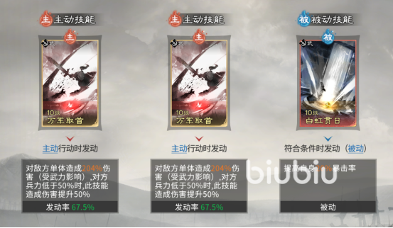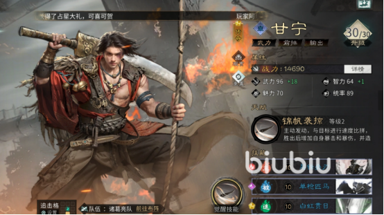 技能配置方面,甘宁主动技必选“万军取首”,该技能基础倍率优异,且对兵力低于30%的目标额外提升40%伤害,完美契合收割场景;追击技无需装配,避免技能冲突导致输出断档;被动技首选“白虹贯日”,稳定提供20%暴击率加成,显著加快暴击循环节奏,保障高频高额伤害输出效率。