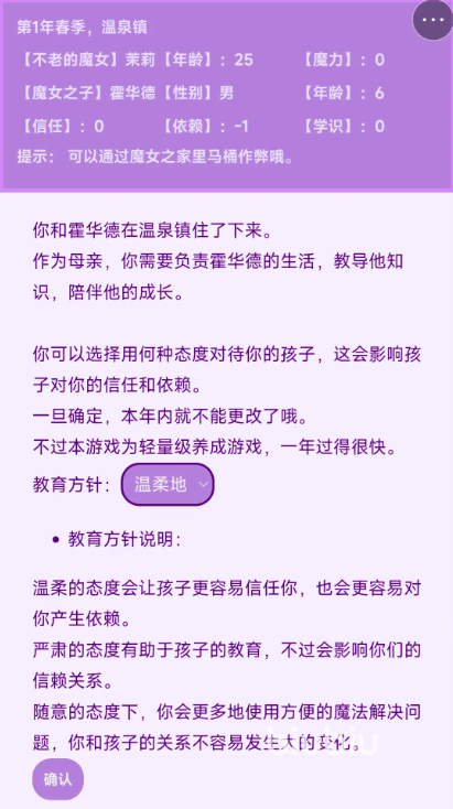 在养育过程中,玩家需全程深度参与:从命名、日常对话、教育理念设定,到重大人生节点的选择,每一步都将影响孩子的性格养成与最终命运走向。游戏不限制领养数量,玩家可逐步组建多代魔女家族;更有机会将子嗣培养为新一代不老魔女,解锁“传承者”专属剧情与隐藏结局,全作共设数十种差异化结局路径。