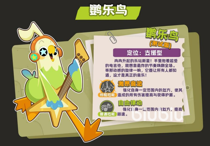 鹦乐鸟则定位于团队增益型角色。其终极技能“激昂音波”可在指定区域生成持续效果,范围内友方单位获得伤害加成与临时护盾,显著提升团战容错率与爆发窗口;另一技能“自由律动”提供范围性移动加速,使队友在进攻推进、战术转点或紧急撤退时获得关键机动优势。该角色虽不具备高威胁单体输出能力,但对整体队伍节奏掌控力极强,尤其在需要频繁拉扯、多线联动的中后期对局中,其战略价值远超表面数据所呈现的强度。