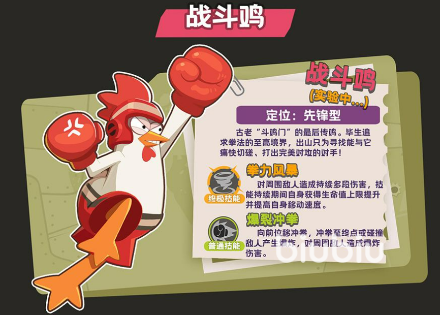 战斗鸡作为近战压制型先锋,主打高风险高回报的贴身作战体系。其终极技能“拳力风暴”开启后,角色进入多段范围持续打击状态,同时提升最大生命值与移动速度,形成“越战越强”的滚雪球效应;另一技能“爆裂冲拳”为直线突进型技能,命中敌人或抵达路径终点时触发范围爆炸,兼具位移、控制与瞬时伤害三重效果。该角色对玩家的地图意识、切入时机判断及反制预判能力要求较高,适用于偏好高强度对抗、擅长利用掩体与地形发起突然袭击的进阶玩家。