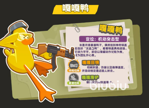 嘎嘎鸭是新手友好型角色的代表。其标志性技能“嘎嘎目镜”为终极技能,激活后同步提升射速、基础伤害与换弹速度,并附带自动索敌功能——可优先锁定视野内最近目标,大幅降低瞄准门槛;另一主动技能“嘎嘎滑铲”支持定向位移,兼具规避火力与调整身位双重作用。二者协同使用时,能实现“开镜—突进—清场—撤离”的高效循环,尤其适合尚未熟练掌握预判射击或地图走位的新手玩家建立操作信心。