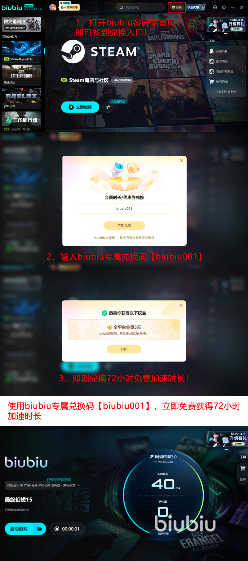 当前新用户可领取双重免费加速权益:输入通用兑换码【biubiu001】即可获得3天全功能加速时长;另享专属新手礼包,额外赠送24小时加速权限。两项福利支持叠加使用,最高可累计96小时无限制加速服务,充分覆盖中长周期游戏需求。