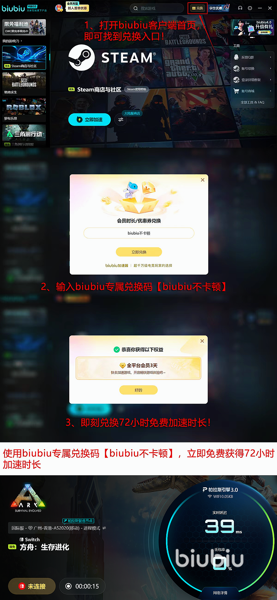 现在新用户完成注册,就能立即免费享受24小时全游戏不限速加速服务;所有用户在兑换中心输入【biubiu不卡顿】,还能额外领取3天免费加速时长,让你畅玩游戏全程告别卡顿与掉线。