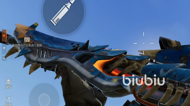 第二款皮肤「AK-浪刃鲨纹」则面向偏好近战对抗与战术射击的玩家群体。枪体主色调采用哑光枪灰,辅以银白渐变鲨鱼鳞纹,纹路自枪口延展至护木末端,线条流畅富有张力。持握状态下,鲨鱼尾部呈现自然摆动动画;整枪泛出柔和冷调蓝光,细节刻画精细。瞄准时,机械瞄具内圈边缘被重构为锯齿状鲨牙造型,既强化主题统一性,又优化视觉焦点引导——实测显示,该设计可提升瞄准稳定性感知,尤其利于习惯使用机械瞄具的玩家快速锁定目标。