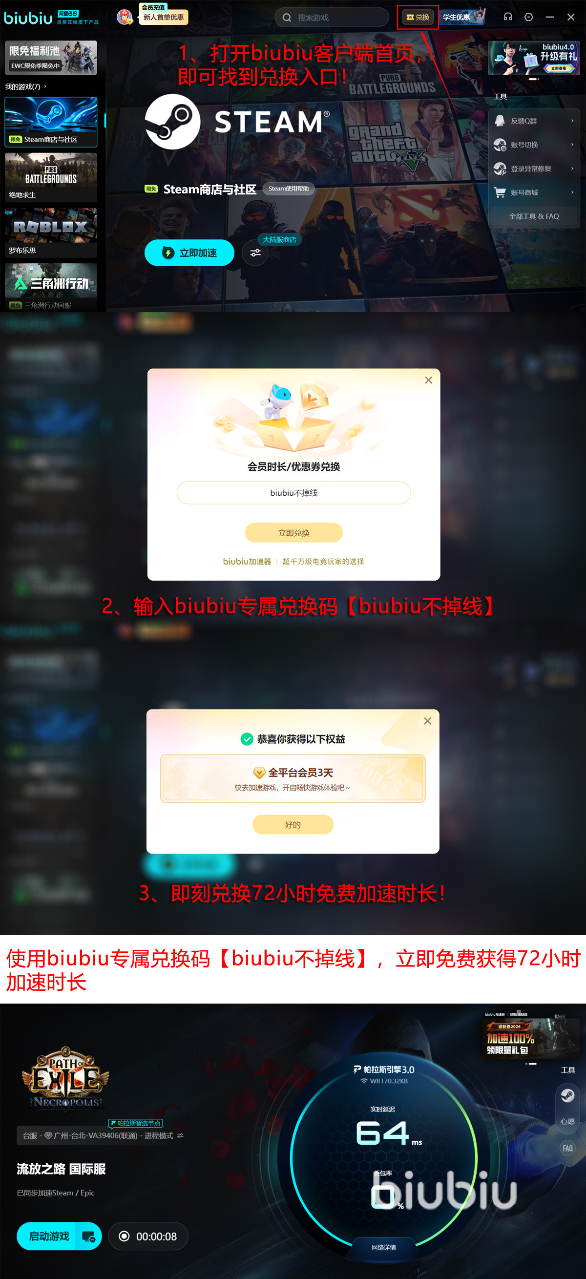 新用户注册即可获赠24小时基础加速时长;输入专属口令【biubiu不掉线】还可额外领取3天有效期,累计享有96小时免费使用权益。该福利适用于S29赛季全程,覆盖开荒期、中期冲榜及后期极限挑战各阶段需求。