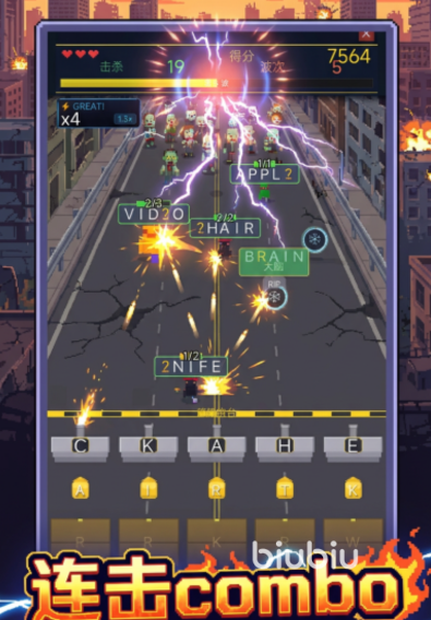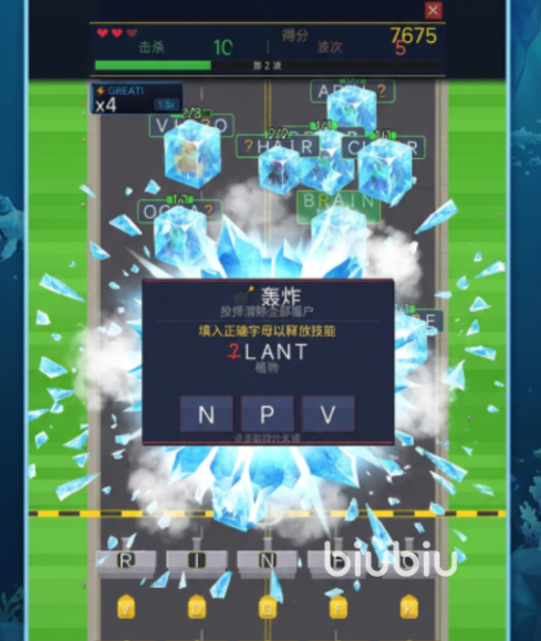 游戏构建了双轨成长体系:一方面通过关卡推进解锁更高难度的词汇库,涵盖基础词根、高频短语及学术类表达;另一方面依托连击系统实现战力跃迁——连续正确拼写触发连击,每提升一级连击数,武器伤害、技能释放频率与特效强度同步增强。冰冻、轰炸等战术型技能可打断僵尸阵型,其中轰炸技能具备大范围AOE效果、多目标锁定能力及击退判定,在应对高密度尸潮时尤为关键。