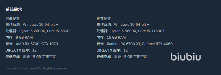 推荐配置则面向追求完整视听体验的玩家:CPU建议Intel Core i5-11600K或AMD Ryzen 5 5600X起步,若需稳定开启光追特效,强烈建议升级至i7级及以上平台;显卡明确要求NVIDIA RTX 4060或同级性能产品;内存提升至16GB,并推荐将游戏安装于NVMe固态硬盘,以确保快速加载与无缝场景切换。游戏本体安装空间需求为15GB。