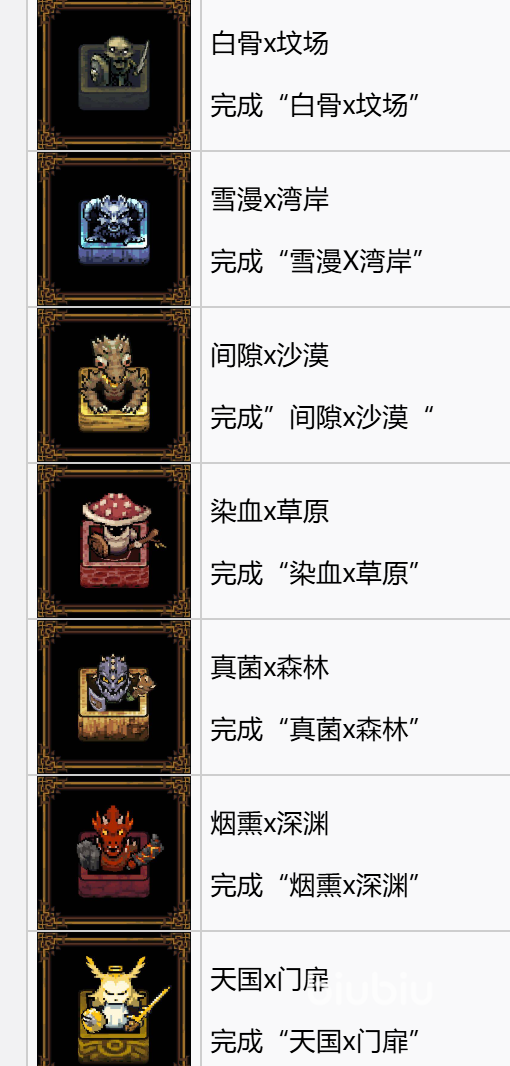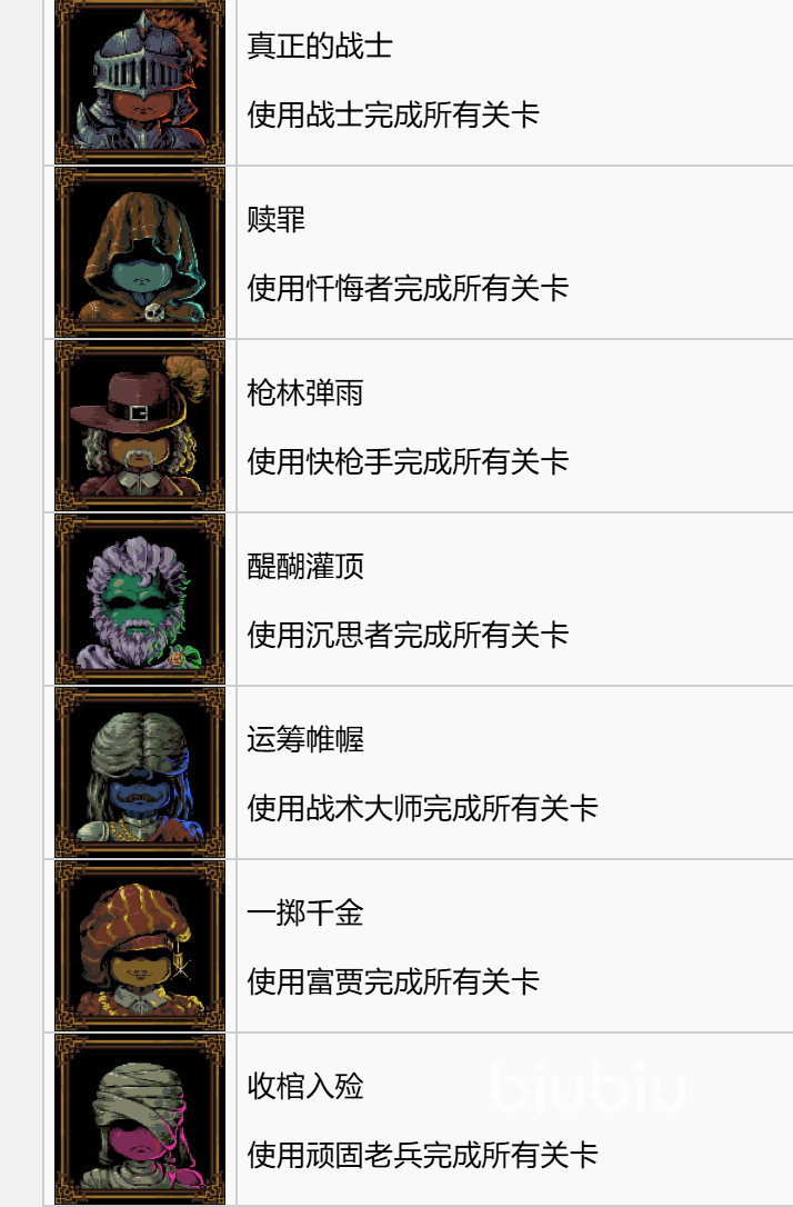 主线通关是白金奖杯的基础门槛。游戏共设十二个主线场景:白骨、坟场、雪漫、湾岸、间隙、草原、真菌、森林、烟熏、深渊、天国、门扉、浩瀚——需以标准模式完成全部关卡。此外,每关还需分别使用十位不同角色通关,方可激活“征服者”成就。这一设定倒逼玩家主动解锁并熟悉战士、快枪手、忏悔者、战术大师、极端分子、空巢老人等基础角色的定位差异,并进一步拓展至物理学家、盾卫、西西弗斯、鞭笞者等进阶单位,形成跨角色协同作战能力。