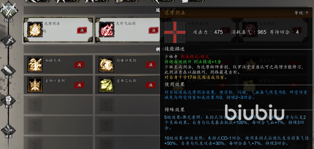 达摩剑法的核心机制由三大模块构成:其一为【锁血禁疗】,使目标在技能持续期间完全丧失生命恢复能力,对具备高频自愈、群体回血或护盾再生特性的Boss具备绝对克制效果;其二为【穿透伤害】,无视目标闪避率与减伤类增益,以100%真实伤害结算,不受防御属性与减伤心法影响;其三为【全队增益】,每次命中触发后,提升全队基础攻击倍率15%,附加每秒5点真气回复及连段数+2,显著强化爆发流与速攻流配队的输出循环效率。