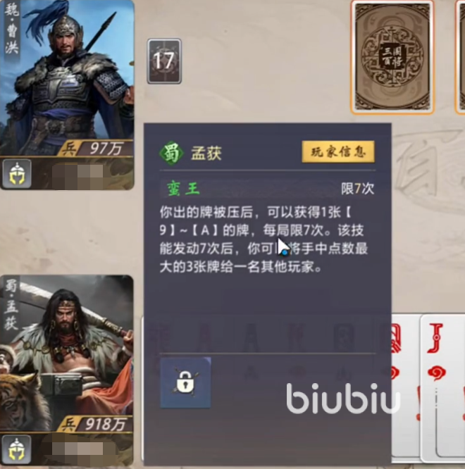 孟获的基础技能设定为:每当玩家打出的牌被其他玩家成功压制时,立即获得一张点数介于9至A之间的手牌,单局内最多触发7次。这一机制显著缓解了中前期手牌枯竭的风险,尤其在面对高频压制类武将或连击流阵容时,能持续维持出牌链的完整性。值得注意的是,该补牌效果不依赖主动发动,而是被动响应,因此对玩家的局势预判与出牌节奏把控提出更高要求。