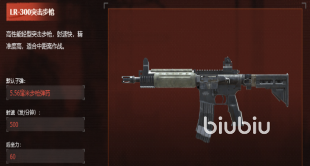 LR-300是一款轻量化全自动步枪,综合性能均衡:理论射速达每分钟500发,后坐力控制值为60,标准弹匣容量30发。其瞄准精度良好,中距离(约40–70米)持续扫射时枪口上跳幅度可控,输出稳定性优于同级多数自动武器。获取途径包括两种——击败地图精英怪物有概率掉落成品;或收集指定配件与基础材料,通过制作台自主组装完成。