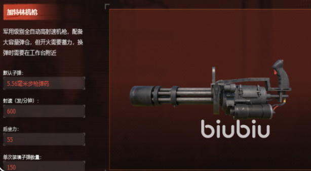 加特林机枪作为高持续火力代表,拥有超大容量弹鼓与极强的压制能力。但其存在明显操作门槛:开火前需2秒蓄力时间,无法实现即时响应;且仅支持在固定工作台完成弹药补给,不具备野外快捷换弹功能。该武器更适合部署于据点防守、资源点争夺等可预判交战节奏的场景,不推荐用于高机动性游击或突发遭遇战。
