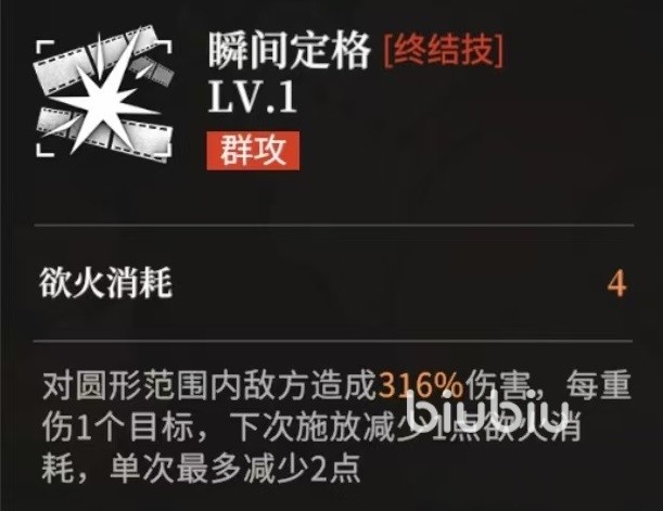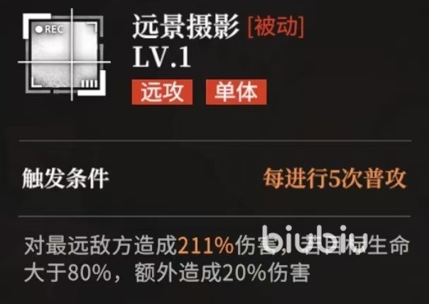 技能设计上,被动“远景摄影”每完成5次普攻自动触发,锁定全场距离最远的敌方单位造成高额伤害;若目标当前生命值高于80%,额外附加伤害加成。大招“瞬间定格”为圆形范围伤害技能,可对区域内敌人造成大量物理伤害;每次击杀处于重伤状态的目标,将使下一次大招能量消耗减少1点,最多减免2点。由此可知,该角色高度依赖队友提供重伤、减防、压血线等前置条件,自身承担的是终结环节,而非全程主导输出。