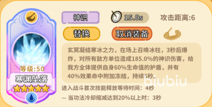 该技能的核心价值在于护盾量:可为全体友方单位提供相当于其当前生命值60%的护盾,按中高配队伍平均血量估算,总护盾值约为37万。对比菩提锤单体70万左右的裸伤数值,该护盾相当于吸收近半次高强度爆发伤害。需强调的是,护盾与治疗属于不可互换的两种机制——护盾能有效拉高队伍单次承伤阈值,防止后排被瞬秒,为治疗技能争取关键反应窗口。此外,“寒渊坠落”附带40%概率施加持续6秒的冻结效果。虽然触发率未达稳定控制标准,但冻结具备独特机制优势:不受护盾与地藏戍卫阵等常规抗性影响,被冻结单位将强制中断行动并暂停所有技能冷却,常可在关键时刻打断敌方治疗链或打乱核心输出节奏,具备不可忽视的战略扰动价值。