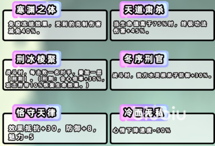 资质方面,玄冥的大招具备45%的基础伤害加成,并可在击杀敌方单位后叠加会心倍率与吸血效果。但受限于较低的神识成长、偏低的大招系数以及初始会心数值不足,每层“刑荆”带来的实际增伤幅度不足10%,无法承担核心输出职能。防御端提供两项减伤:受克制伤害减免40%,全队水灵根单位额外获得30%防御提升。然而因土系输出稀少,该减伤的实际覆盖率偏低;加之游戏内减伤机制普遍存在边际效益递减现象,玩家体感提升较为有限。值得肯定的是,玄冥自带30点抵抗属性,并完全免疫冻结状态,显著降低了被控风险,提升了战场生存稳定性。