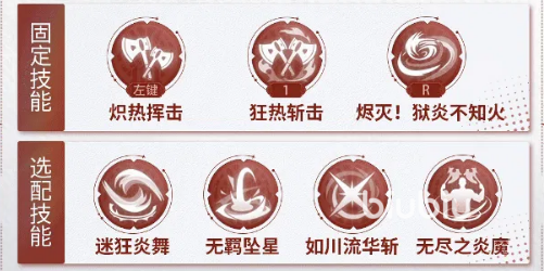 技能配置建议以功能互补为原则:基础输出选用“炽热挥击”保障常态压制;“狂热斩击”必带,用于调整身位与补充充能;大招“烬灭狱炎不知火”提供高额范围爆发与控制效果;“迷狂炎舞”为核心循环技能,强烈推荐携带;备选方案中,“无羁坠星”可增强群体清场能力;偏好流畅连段体验的玩家,可考虑“如川流华斩”提升技能衔接顺滑度。