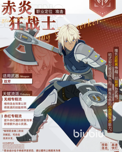赤炎狂战士标志性武器为双持巨斧,职业定位明确——专注近战物理输出。其攻击范围集中于角色周身短距区域,虽不具备远程压制能力,但凭借极高的普攻与技能释放频率,在单位时间内可达成远超常规职业的连击次数,形成高频压制节奏。