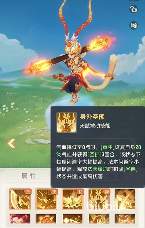 实战层面,孙悟空定位为高机动单体物理爆发神兽,适配全职业体系。其核心被动技能“身外圣佛”具备关键逆转能力:当自身气血归零时,立即恢复20%最大气血,并进入圣佛状态——该状态下物闪与法闪属性同步提升,且释放主动技能“法象天地”时,本次攻击必定触发理论最高伤害值,不受目标减伤、抗性或闪避干扰。这一机制在PVE精英关卡与PVP对战中均展现出极强的容错率与反杀潜力。