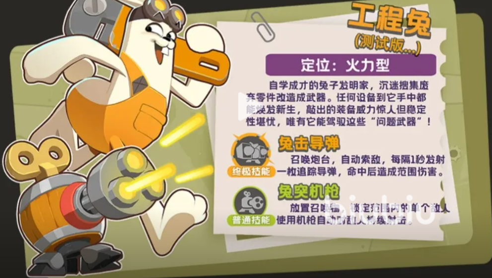 实战中,工程兔不宜主动前压。因其基础防御属性偏低,缺乏硬抗能力。推荐采用“架点+压制+补刀”三段式打法:先择高地或掩体后方完成机枪布防;待敌群接近时激活兔击导弹实施范围压制;自身则居中游走,利用本体武器补充伤害并规避集火。合理利用召唤单位吸引仇恨,可显著降低生存压力,提升整体作战容错率。