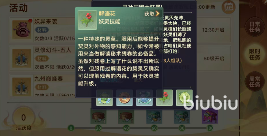 参与门槛方面,角色等级须达到30级方可入场。活动虽难度适中,但对时间把控要求严格——仅12:30整点开放入口,无延时或重开机制。奖励方面,除基础经验与游戏货币外,还可稳定获取中级伙伴修炼丹、初级灵露两类关键培养资源,用于提升伙伴战力及契灵成长;此外,解语花作为后期释放妖灵技能的必要消耗道具,亦有概率掉落,其稀缺性与实用价值较高,建议玩家坚持每日参与,优先积累此类战略物资。