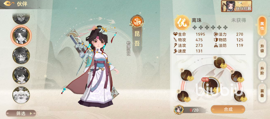 为弥补控场角色输出不足的问题,需配置高爆发物理系角色离珠。该角色品质为优品,主动技能可对单体敌人连续攻击3次,每次造成90%+140点物理伤害,并附带50%生命吸取效果;但使用后需休整1回合,且技能冷却长达6回合。另一机制为:当离珠获得15点先发速度时,可触发替代技——对单体连击2次,每次造成70%+120点物理伤害;同时常驻被动提升自身物理攻击力2%,并依据已损失生命比例提供15%至30%区间浮动的伤害吸血效果,兼顾压制力与续航能力。