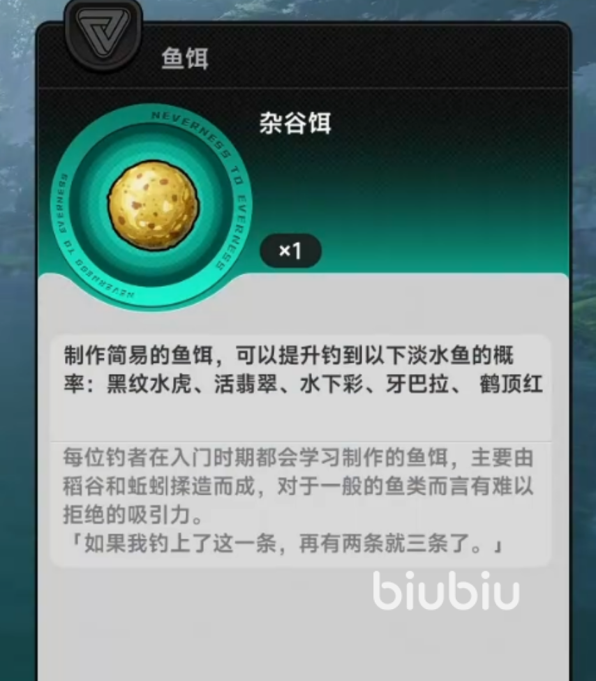 杂谷饵属于定向强化型饵料,由稻谷与蚯蚓按固定比例调制而成,原料获取成本低且合成步骤简易。该饵料对特定淡水鱼种具有显著概率增幅效果,实测数据显示:黑纹水虎捕获率提升约37%,活翡翠提升42%,水下彩提升35%,牙巴拉提升39%,鹤顶红提升33%。由于目标鱼种全部限定于淡水生态区,玩家在前往青岚溪上游、雾隐湖深潭等点位前,应优先携带此饵。尤其适合等级16–30阶段玩家,在追求特定图鉴收集或任务道具时实现高效定点垂钓。