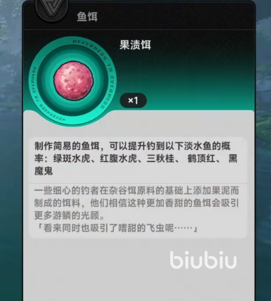果渍饵是在杂谷饵基础上添加天然果泥发酵制成的进阶饵料,挥发性芳香物质浓度更高,持续诱鱼时间延长约2.3倍。该饵料覆盖鱼种包括绿斑水虎、红腹水虎、三秋桂、鹤顶红与黑魔鬼,其中对黑魔鬼的捕获率增幅达48%,为当前版本最高单项提升值。值得注意的是,鹤顶红同时响应杂谷饵与果渍饵,印证其生态适应性广的特点。果渍饵推荐等级31及以上玩家使用,适用于挑战高难度稀有鱼种、冲刺图鉴全收集或参与限时钓鱼活动等场景,能有效压缩单次垂钓的试错周期。
