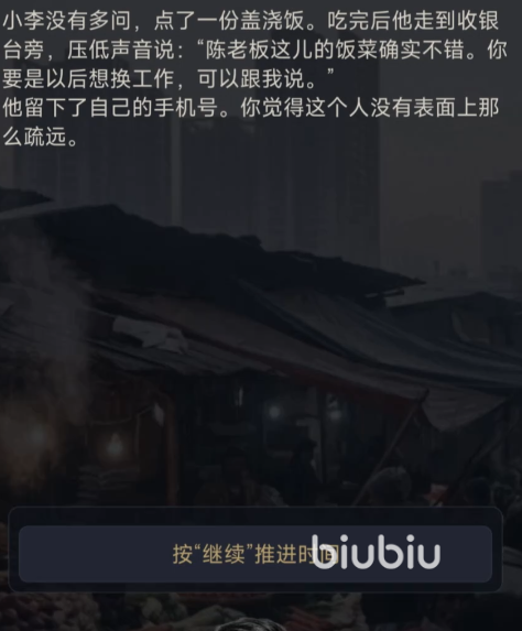经济系统真实而克制。玩家可通过探索触发临时劳动机会,例如搬运货物获得26元收入;求职环节设置合理门槛,多数岗位条件不符,仅有一家餐馆开放帮工岗位,日薪120元。建议优先入职,该选择不仅保障稳定现金流,更可触发后续关键成长线——连续工作将激活陈老板涨薪事件,薪资随工龄逐步提升。