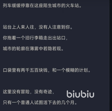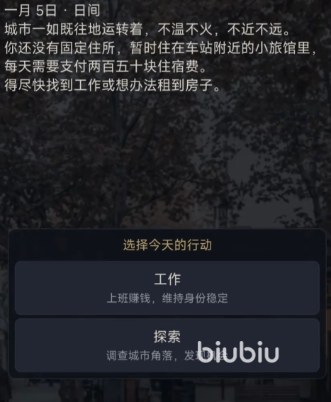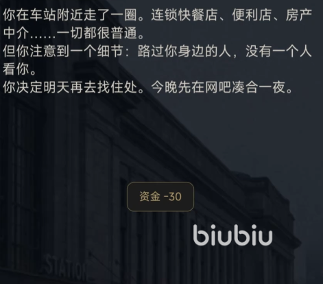 游戏开局即设定高度具象化的生存起点:玩家扮演一名初抵陌生城市的外来者,随身仅有2500元现金与一份模糊计划。所有基础需求——饮食、住宿、交通、卫生——均需精打细算。首日抵达后,列车停靠于城市火车站,主角衣着整洁却陈旧,周围人群漠然无视,这种疏离感悄然铺开世界观基调。因未能即时寻得住所,暂宿网吧成为无奈之选;次日则入住日租金250元的小旅馆,资金压力立现。