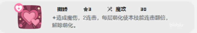 首推技能为撒娇:基础威力中等,但若菊花梨自身处于萌化状态,则造成两次攻击且总伤害翻倍。这一增幅并非简单叠加,而是直接作用于每次命中,使其在萌化开启后的单回合爆发力显著跃升,是无可替代的主力输出技。