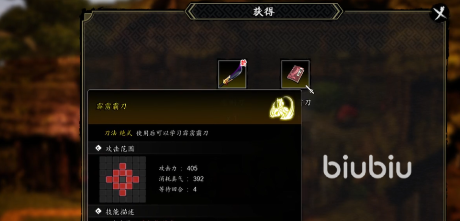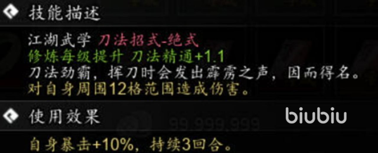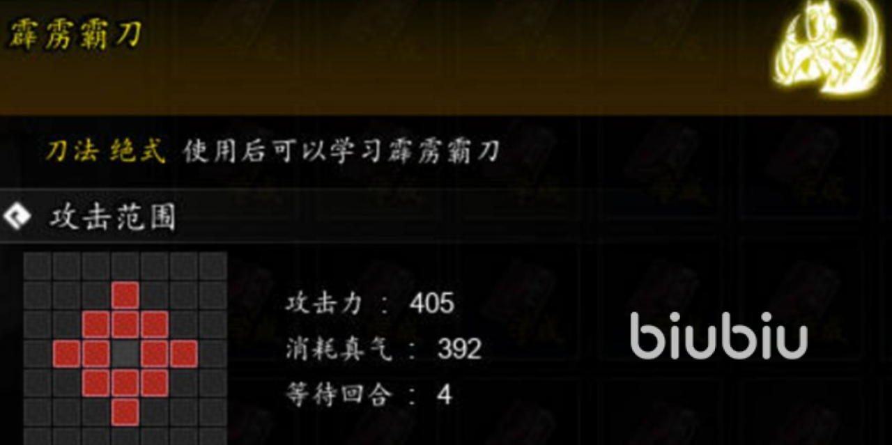 该武学为范围型攻击技能,施展时可对角色周围12格内全部敌方单位造成伤害,基础攻击力达405点,消耗真气392点,冷却时间为4回合。除直接伤害外,成功释放后还将为主角附加“雷霆之势”效果:暴击率提升10%,持续3回合。此增益显著强化后续输出节奏,在应对高血量Boss或精英怪时尤为高效,大幅压缩单场战斗耗时。