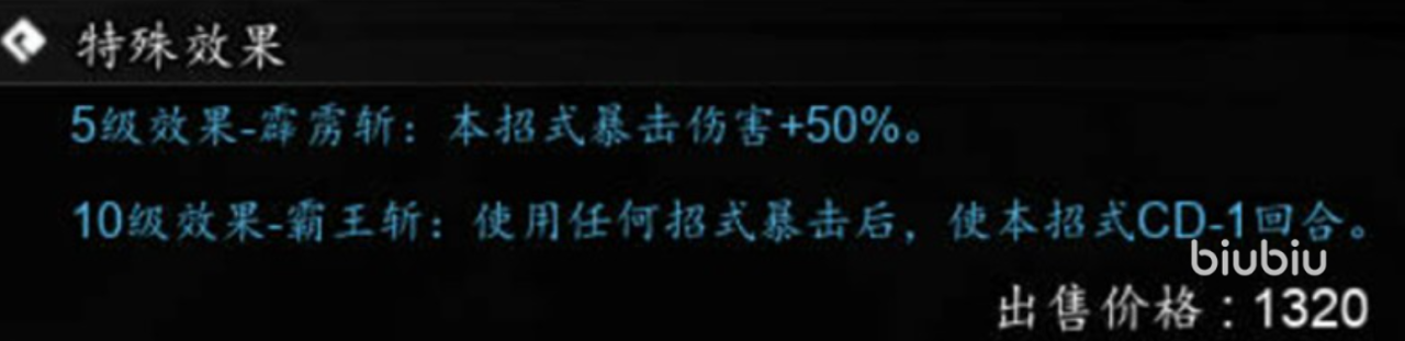 技能等级提升将解锁进阶机制。升至5级时激活“霹雳斩”效果:暴击命中时额外增加50%伤害,进一步放大瞬间爆发潜力;当技能等级达到10级,则触发“霸王斩”机制——每当其他招式打出暴击,霹雳霸刀冷却时间减少1回合。双机制叠加,使该技能可高频衔接,形成稳定而凌厉的连击循环。