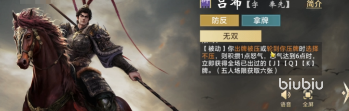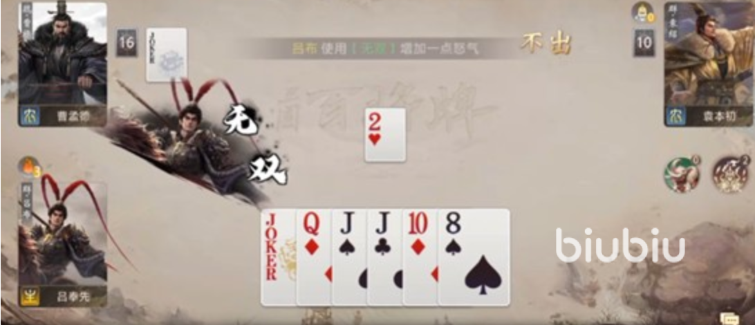 应对吕布怒气机制,主流策略分为两类:一是“前置压制”,即在怒气未达6前快速清空己方手牌,压缩其形成高阶牌型(如顺子、连对、炸弹)的空间;二是“关键牌管控”,主动延迟或规避J、Q、K的释放时机,尤其避免在吕布可弃权的回合打出此类牌,从而阻断其怒气增长路径。实战中二者需动态协同——依据对手当前怒气数值、剩余手牌数量及出牌倾向,实时调整己方出牌序列,在维持控场权的同时,最大限度削弱技能触发收益。