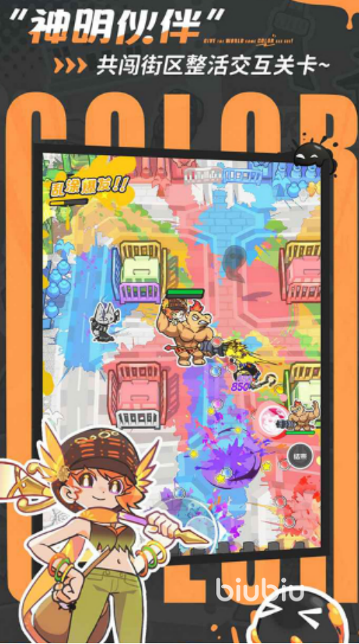 游戏采用全角色共享养成体系,所有神明共用等级、技能强化与染色核心资源,避免重复培养负担。零硬性付费门槛设计保障公平性,战斗强度主要取决于操作熟练度与阵容搭配逻辑,而非数值碾压。美术层面运用二次元卡通渲染技术,角色立绘兼具考据感与戏谑感,颜料泼洒、色块扩散等动态特效均经逐帧优化,强化视觉爽感与沉浸节奏。