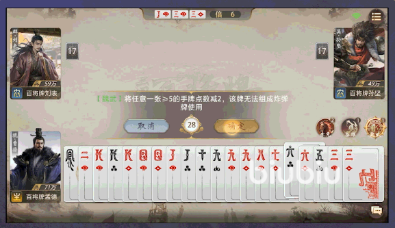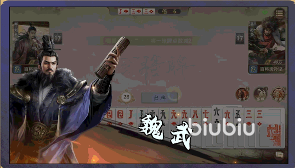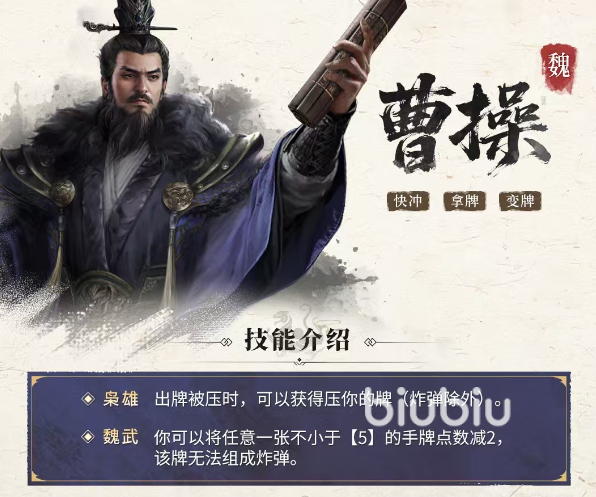 曹操在该作中属于高策略性成长型角色,无固定连招模板,胜负关键取决于玩家对局势的预判能力与手牌资源的动态调度。其两大主动技能——魏武与枭雄,构成攻防一体的核心循环:魏武允许玩家自主调整一张手牌点数,降低2点数值,从而突破原有牌型限制;例如将Q(12点)调整为10(10点),即可与相邻点数牌组成顺子,或补足三张同点牌形成飞机(三带一)、炸弹等高阶组合。