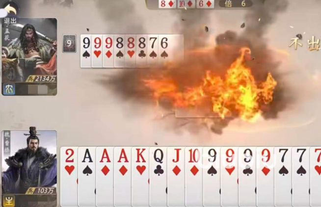 枭雄技能则赋予反制能力:当己方出牌被对手压制时,可直接获得对方用于压制的那张牌。该机制不仅扩充手牌数量,更可打乱敌方节奏,为后续爆发积蓄资源。典型开局思路为:主动打出三代、连对等低点数牌型,诱导对手使用大点数单牌或对子压制;随后触发枭雄回收关键牌,再结合魏武改造剩余手牌,快速构建三带一、顺子甚至炸弹,在中盘阶段形成压制性输出。