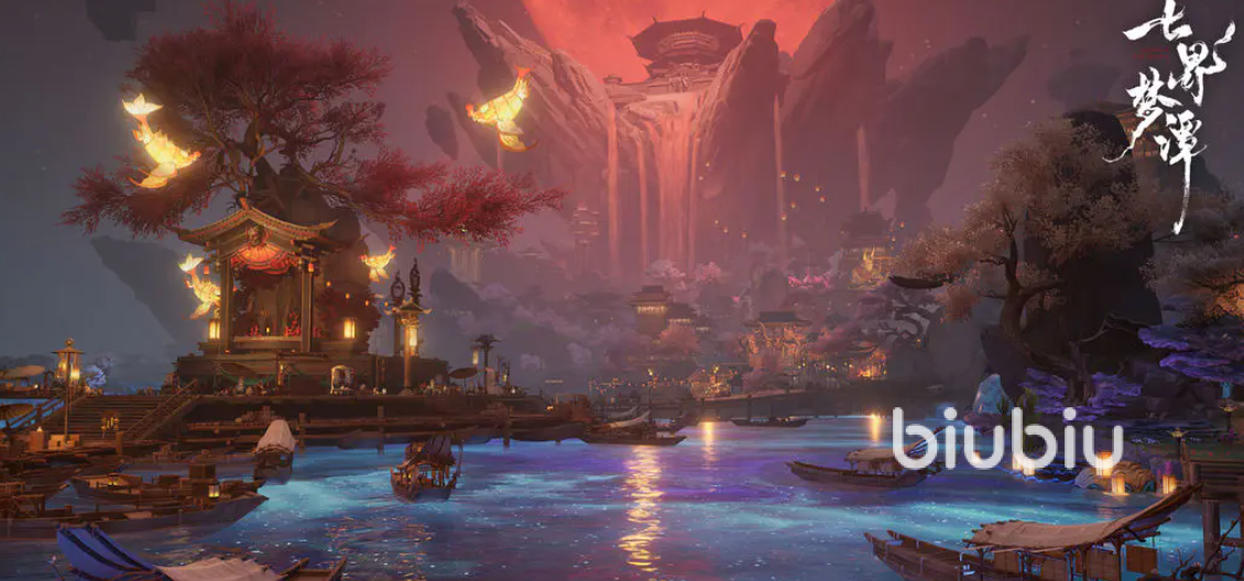 视觉表现层面,《七界梦谭》依托高精度3D建模与物理级光影渲染技术,还原山海经式奇观地貌——云雾缭绕的悬空峰峦、荧光浮动的幽冥沼泽、四季轮转的灵植群落等场景细节丰富且富有文化辨识度。音频系统融合古琴、箫、编钟等传统器乐采样与交响化编曲,战斗音乐强调节奏张力,探索配乐侧重意境留白,配合全域动态天气与昼夜循环系统,构建出层次分明、呼吸可感的东方玄幻世界。