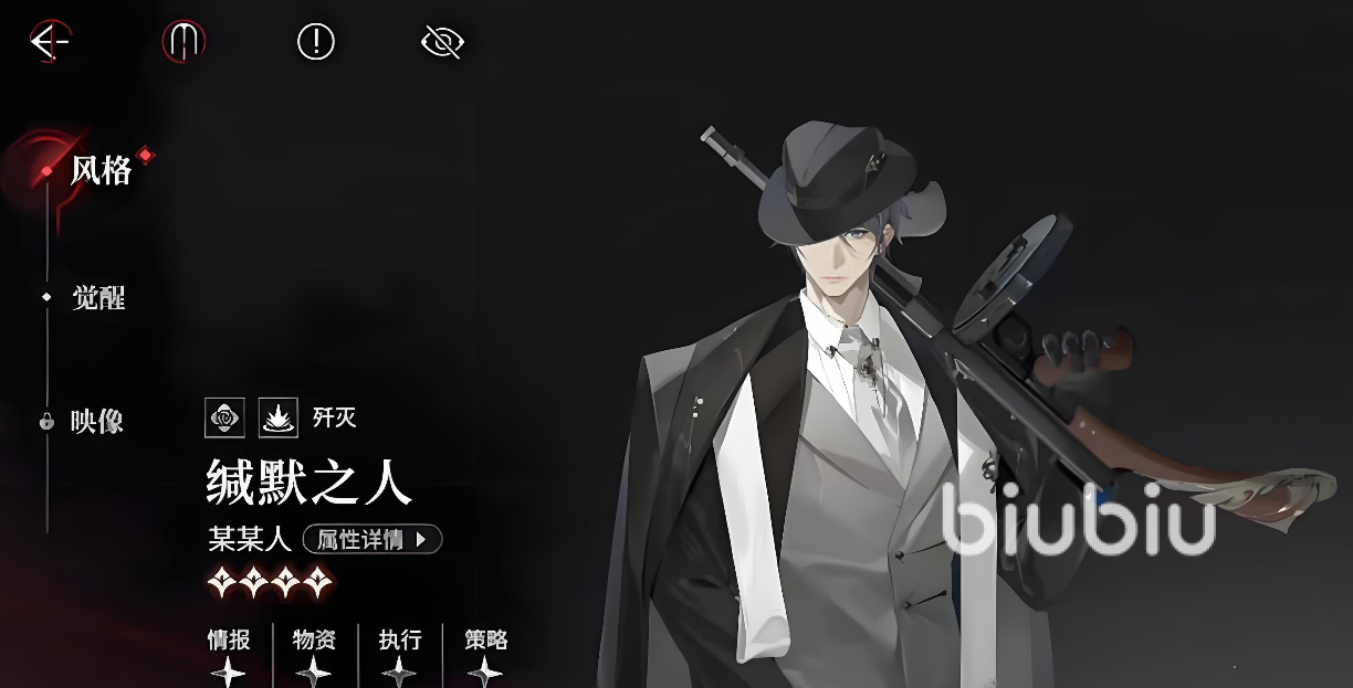 从外观设计来看,“缄默之人”以黑帮杀手为视觉主题:礼帽、修身西装与冲锋枪构成标志性形象,高度契合游戏整体的暗调叙事氛围,因此在角色外观辨识度与风格统一性上具备较强优势。在角色养成路径中,该风格卡牌属于四星品质,但凭借较高的基础攻击面板与较快的普攻节奏,在输出梯队中具备稳定站位能力。