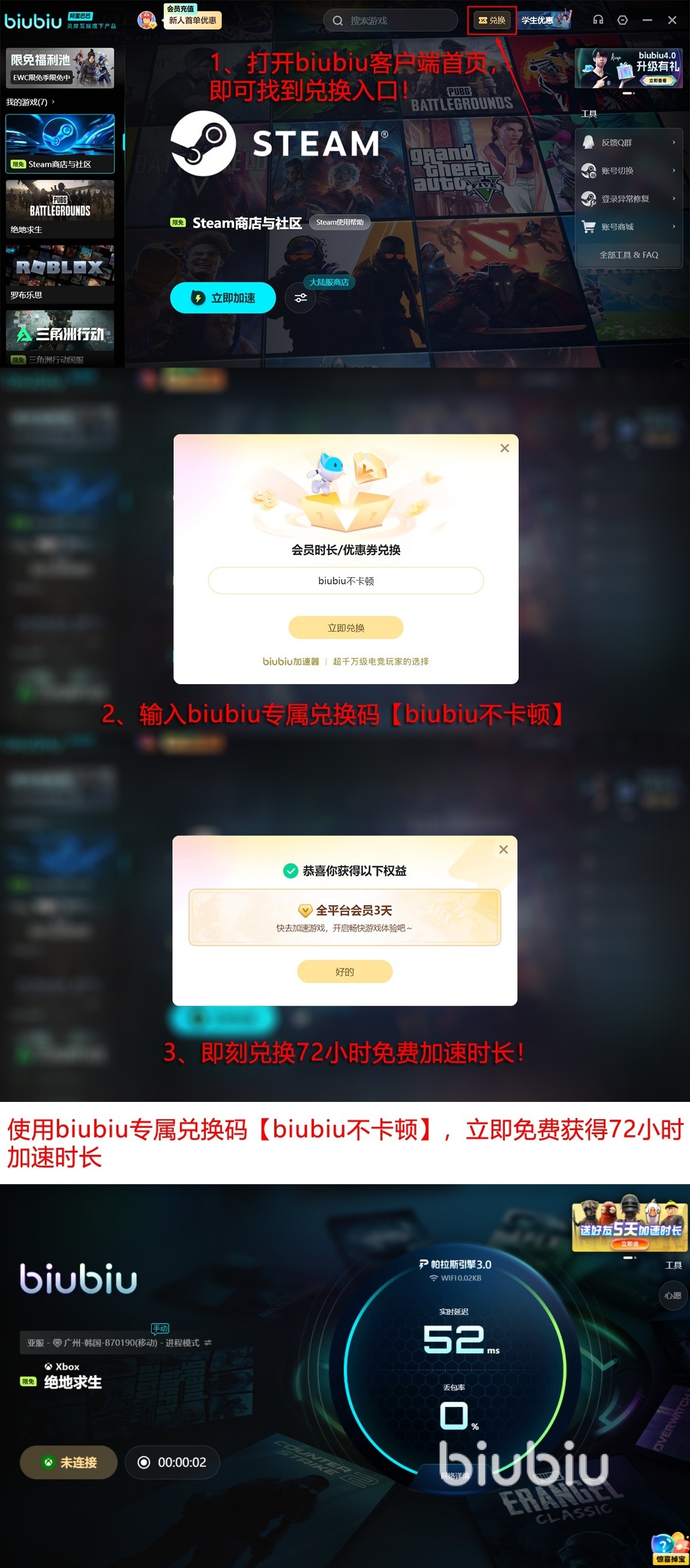 现面向全体玩家开放实测通道:新用户完成注册后,自动获赠24小时全功能试用权限;前往客户端兑换中心,输入口令【biubiu不卡顿】,即可额外领取3日加速时长。新老用户均可参与,新人最高可累计享受96小时无门槛体验,直观对比优化前后帧生成稳定性与操作跟手性提升效果。