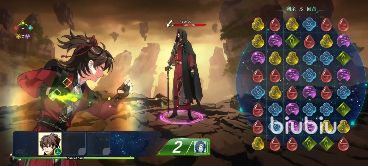 战斗系统采用创新的三消策略模式,摒弃传统自动战斗逻辑,强调操作节奏与战术预判。玩家需在限定回合内,通过滑动消除同色“灵珠”触发角色攻击。系统支持多消(一次消除多个同色珠)与连消(连续成功消除触发多次追加攻击),其中多消可激活特殊增益效果,提升后续输出效率;连消次数直接决定单次行动的攻击段数,形成清晰可控的伤害反馈链。