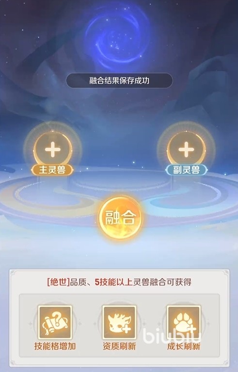 合宠操作入口位于宠物界面的“附灵”模块。玩家需指定一只主灵兽(即待强化对象)与一只副灵兽(即“胚子”)。主灵兽将完整保留,而副灵兽将在合成后永久消失。副灵兽所携带的部分技能存在概率性继承机制——主灵兽可能新增1至多个技能,也可能因随机性导致最终技能总数少于合成前。该过程不可控、无预览,因此建议玩家储备多只符合条件的高品质胚子,以提升理想技能组合的产出率。