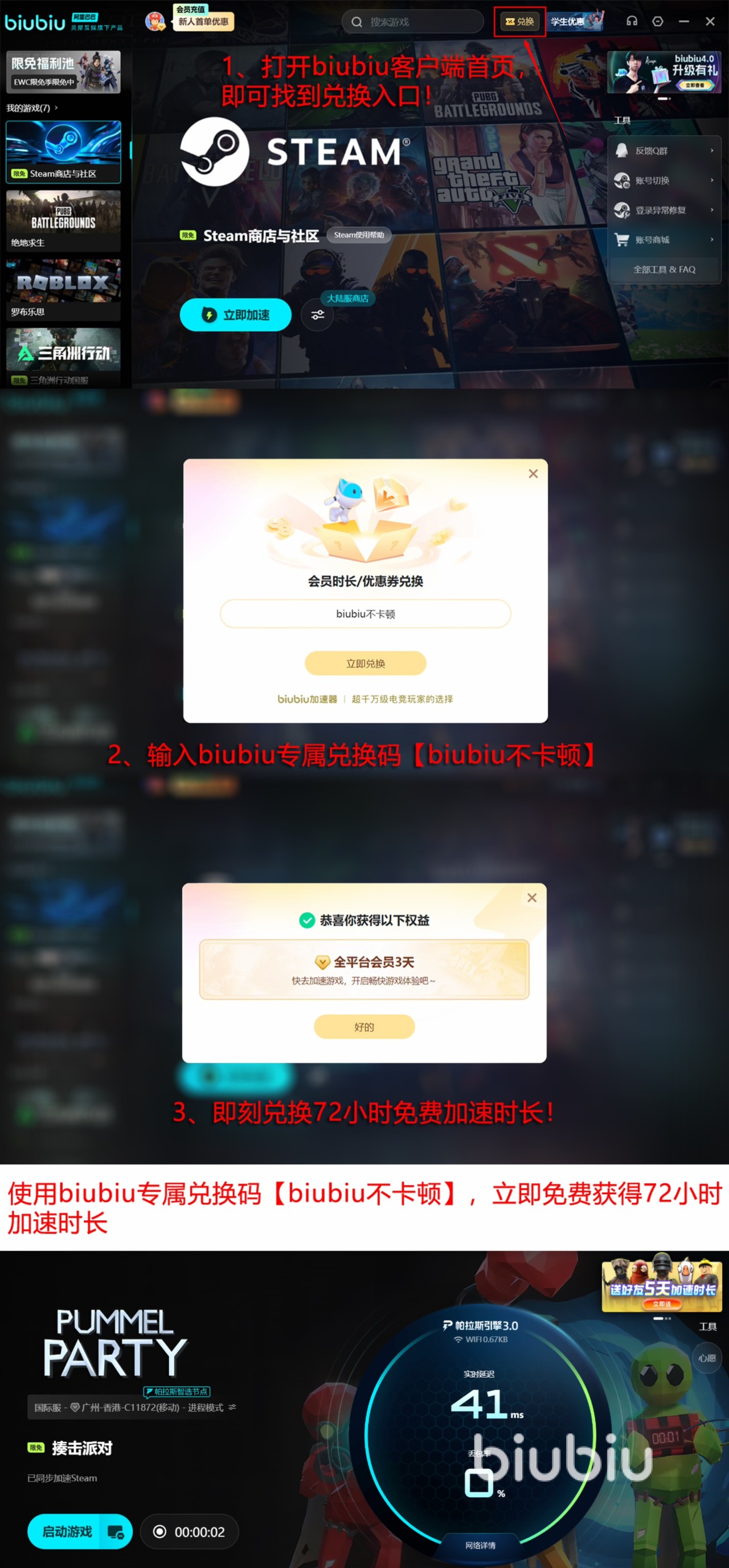 除技术性能外,biubiu还提供切实可用的新手权益:新注册用户可直接获得24小时全游戏通用加速时长;所有已注册用户(无论使用时长),输入口令【biubiu不卡顿】即可额外领取3天高级加速服务,无需付费或绑定支付方式。