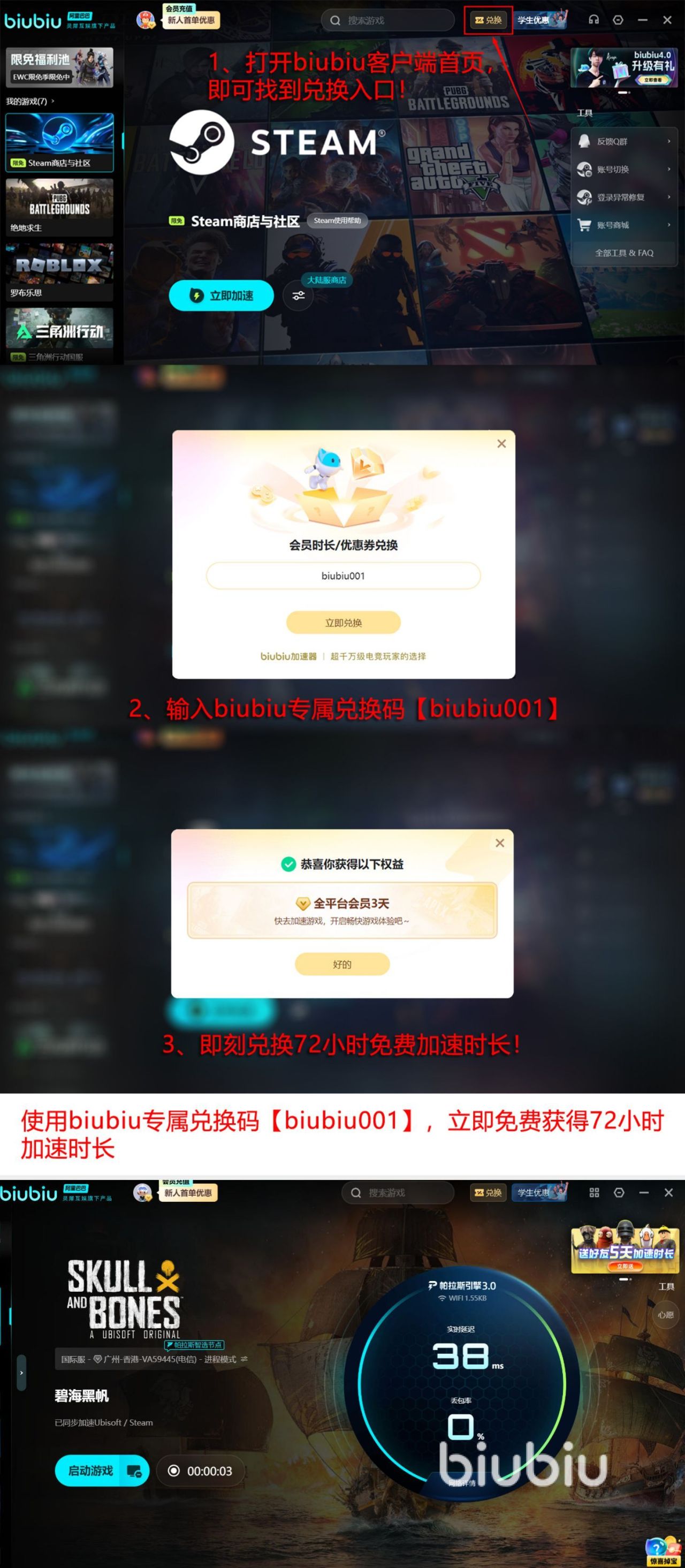现面向全体玩家开放限时福利:新用户完成注册并安装后,即可获赠24小时免费加速时长;所有用户输入兑换码【biubiu001】可额外领取72小时加速权益;新用户还可叠加享受总计96小时全平台无限制免费加速服务。