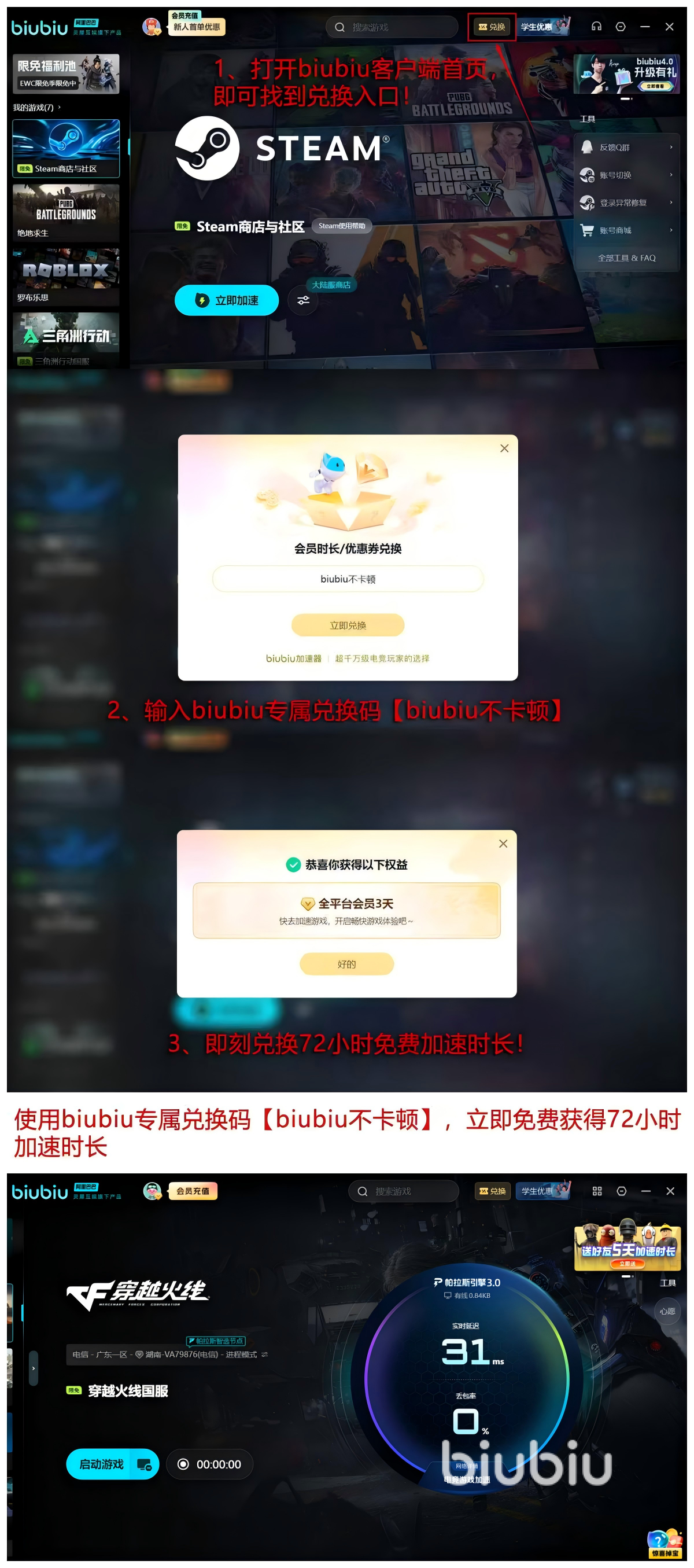 目前,输入【biubiu不卡顿】口令即可领取72小时加速时长;新注册用户还可额外获得24小时新手福利,累计达96小时免费使用权限。该权益覆盖CF全服区段,适用于日常训练、排位赛及大型赛事观战等多场景需求。